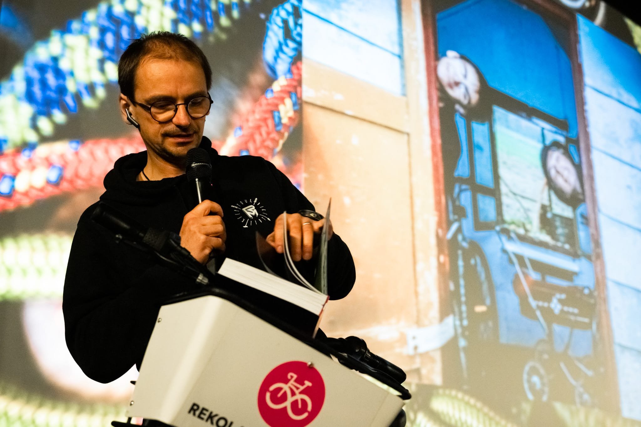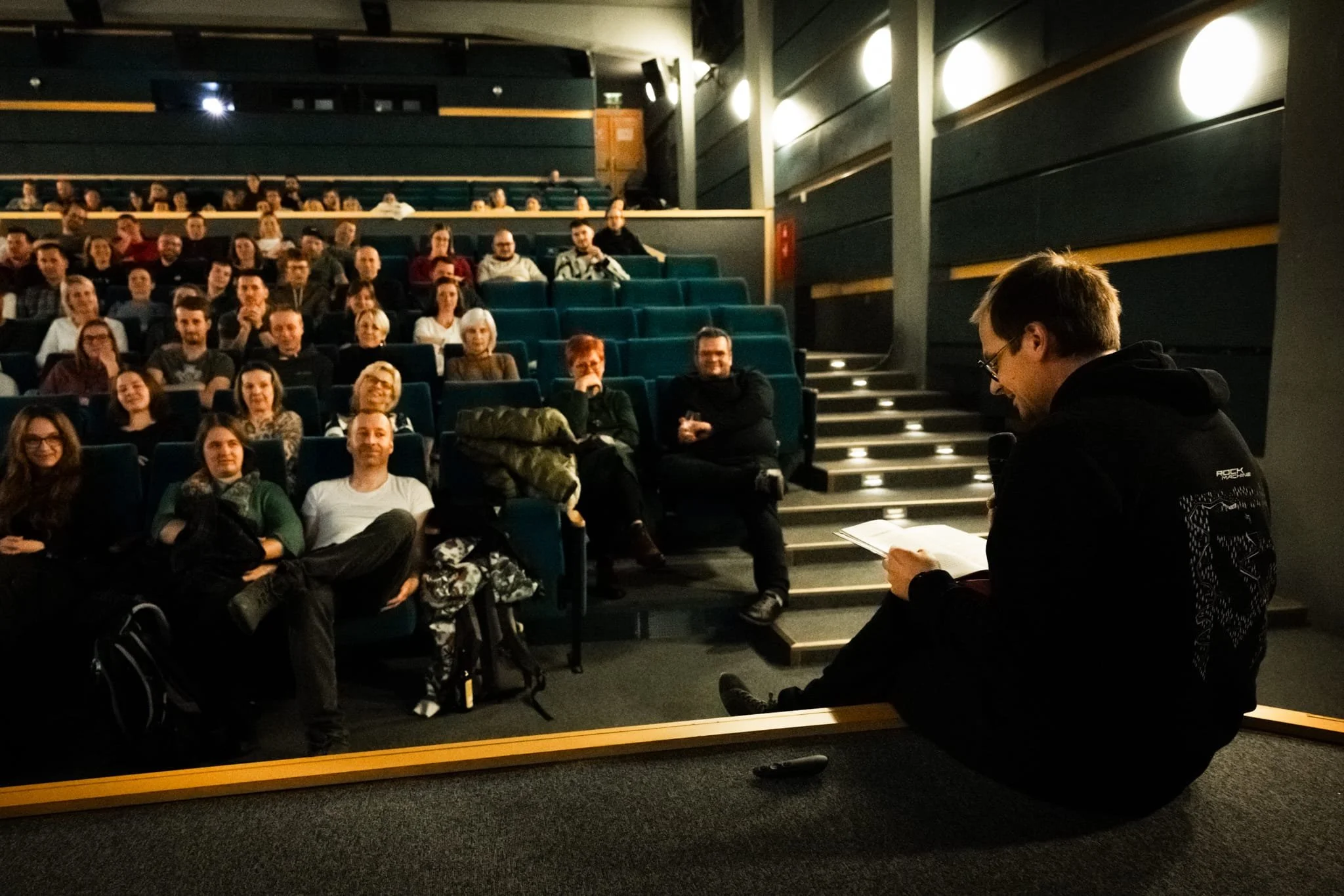 Přednášku jsem začal autorským čtením z nové knížky. Byl jsem zrovna v nejlepším, když mi vnitřní hlas zašeptal: „Taky Tě miluju!“ Úplně jsem zapomněl, že mám v uchu to sluchátko a podíval se kolem sebe, co se děje. Pokračoval jsem dál ve čtení, když se ozvalo: „No tak to je dobrý, haha!“ To už jsem si na přítomnost objektu v uchu vzpomněl a rozhodl se to ještě vydržet, zkusit to.