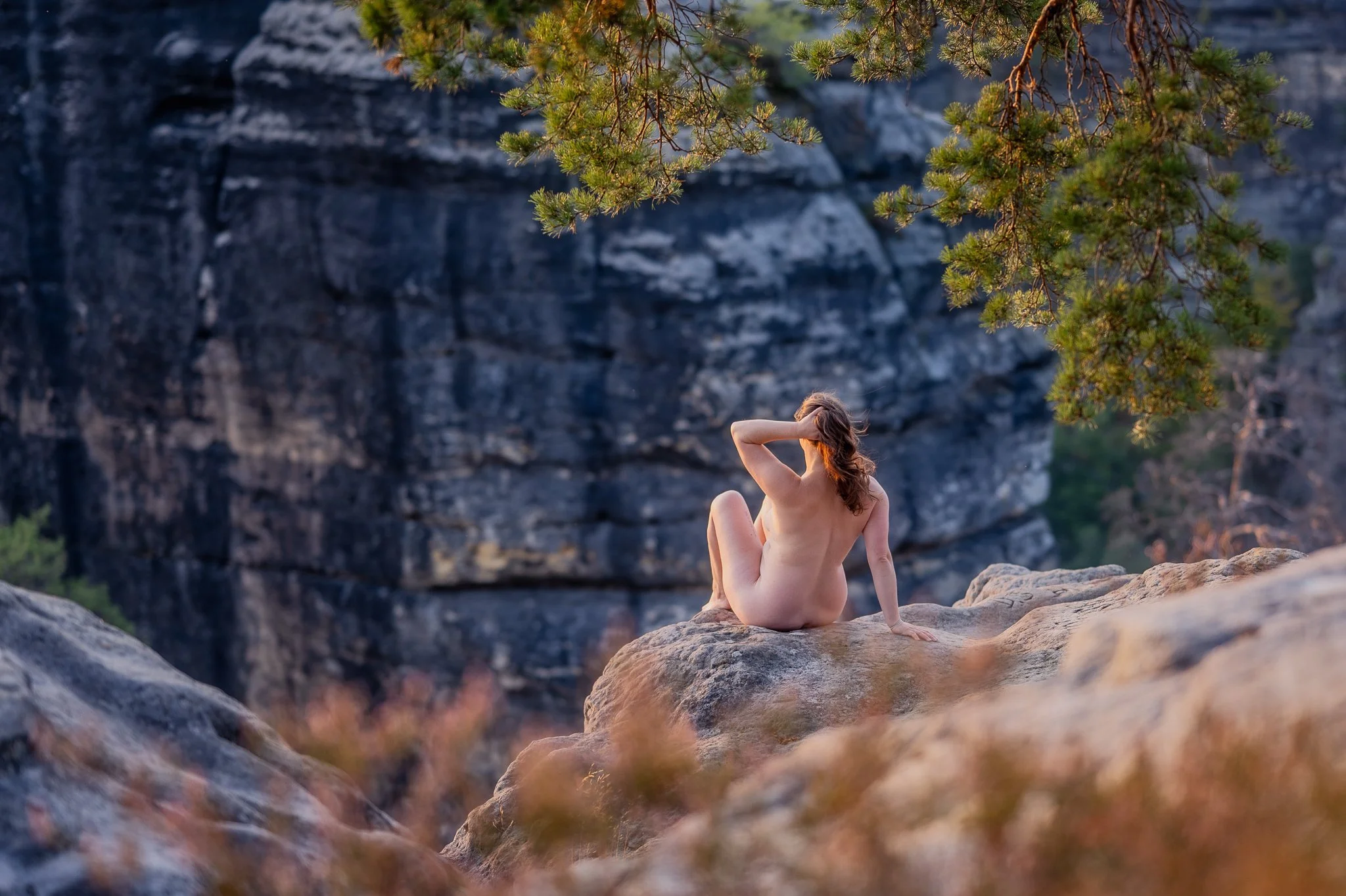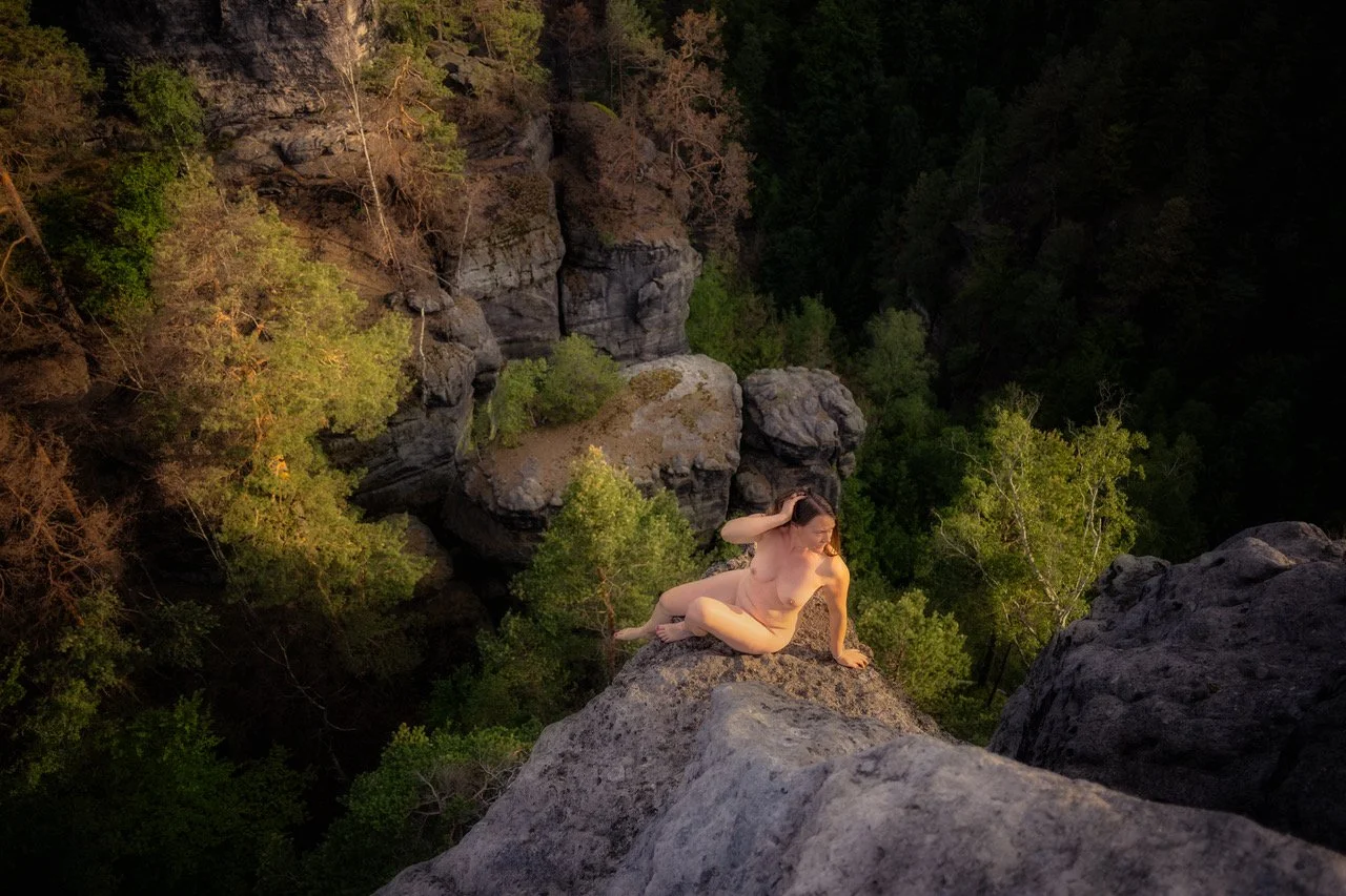 A pak, že dvakrát do stejné řeky nevstoupíš… tedy, alespoň tak to tvrdil jistý Hérakleitos asi dva a půl tisíce let před námi. Přesně před dvěma lety se mě a mým studentům naskytla příležitost přespat na Pravčické bráně, na karimatkách a ve spacácích přímo pod ikonou Českého Švýcarska, které ji má dokonce ve znaku. Ráno po rozbřesku se to nějak sešlo, že jsem namísto východu slunce fotil studentku Blanku na kamenném ostrohu nad propastí, v rouše Evině. To se na mých kurzech občas tak děje a mě to baví, samozřejmě. Blanka tehdy odložila stud a před objektivy dalších studentů ochotně pózovala tak dobře, že na ranní autobus jsme museli běžet. A teď, po dvou letech se situace opakovala do puntíku. Stejné místo, stejná Blanka a stejný úprk na autobus. Hérakleitos měl ale pravdu - řeka byla pozměněna. Ostatní tentokrát fotili na analog a tahle aktuální fotka byla focená při západu.